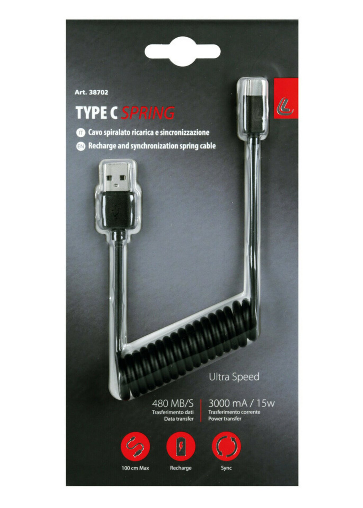 De Lampa Oplaadkabel Type C USB 1M is een krulsnoer met een spiraalvormige structuur.